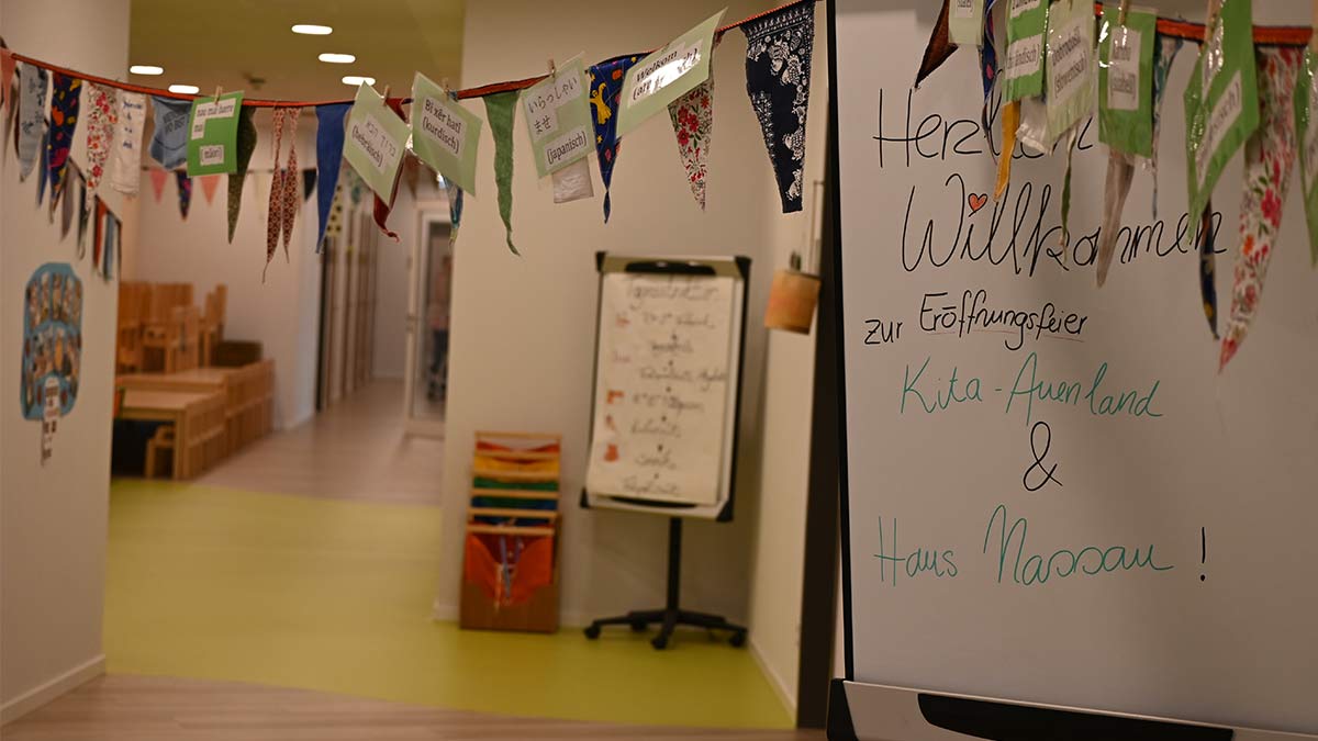 Für dieses Konzept des Schwesternverbandes gratulierten die Redner bei der offiziellen Eröffnungsfeier, die im Mehrzweckraum der KiTa gefeiert wurde. Als Vertreter des Ministeriums war Stephan Kolling, Abteilungsleiter B – Soziales, Inklusion und soziales Ehrenamt, zugegen. Er war, ebenso wie Kreisbeigeordneter Klaus-Dieter Woll, der im Namen von Landrat Sören Meng teilnahm, und Bürgermeister Holger Schäfer vollen Lobes und unterstrichen die Wichtigkeit solcher Generationenprojekte. Sebastian Hahn, der Vorsitzende des Aufsichtsrates des Schwesternverbandes, schloss sich dem an. Thomas Dane, Vorstandsvorsitzender des Schwesternverbandes, begrüßte die zahlreich erschienen Gäste und stellte die beiden neuen Einrichtungen genauer vor. Im Erdgeschoss befindet sich die „KiTa Auenland“, die insgesamt Platz für 79 Kinder im Alter von zwei Monaten bis zum Schuleintritt bietet – aufgeteilt in eine Krippen-, zwei Kindergarten- sowie eine altersgemischte Gruppe. Für alle Kinder kann auch eine Ganztagsbetreuung angeboten werden. Im Obergeschoss befindet sich das familiäre „Haus Nassau“ mit nur 40 Einzelzimmern. Gemeinsame Wohn- und Aufenthaltsräume mit großen offenen Küchen ermöglichen den Bewohnern die Teilhabe am täglichen Leben. Insgesamt investierte der Schwesternverband rund 10 Millionen Euro in den Standort, wovon etwa ein Drittel der Kosten auf die KiTa entfallen und von Land, Kreis und Stadt refinanziert werden.