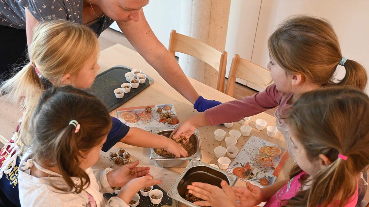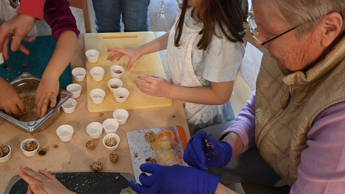 Nach dem Frühstück versammelten sich die Kinder gespannt an ihren Tischen. Gemeinsam wurde überlegt: Was ist eigentlich in einem Müsliriegel drin? Ist süß immer gesund? Und womit kann man Zucker ersetzen? Mit leuchtenden Augen hörten die Kinder, dass natürliche Zutaten wie Bananen, Datteln oder Honig nicht nur süß, sondern auch gesund sind. Dann hieß es: Ärmel hochkrempeln! Mit Begeisterung und erstaunlichem Geschick kneteten die Kinder Haferflocken, Nüsse, Softdatteln und Aprikosen zu einer feinen Masse. Kleine Hände rollten fleißig Kugel um Kugel, die dann in Sesam, Amaranth oder gemahlenen Mandeln gewälzt wurden. Nebenbei erklärte Andreas Hank spielerisch die „Superkräfte“ verschiedener Gemüsesorten: Kürbis ist gut für die Augen oder Zucchini tut dem Bauch gut. Die Kinder staunten – Gemüse als Benzin oder auch Medizin für unseren Körper klang plötzlich spannend und cool. Auch das Team der Kita unterstützte die Kinder. Die Mitarbeiterinnen halfen beim Schneiden und Mixen und sorgten dafür, dass jede kleine Köchin und jeder kleine Koch zum Zug kam. Selbst einige Seniorinnen aus dem benachbarten „Haus Nassau“ nutzten die Gelegenheit, ihre Erfahrungen beim Zubereiten und Backen einzubringen. Sie kamen kurzerhand dazu und unterstützten die Kinder, was Jung und Alt erfreute.